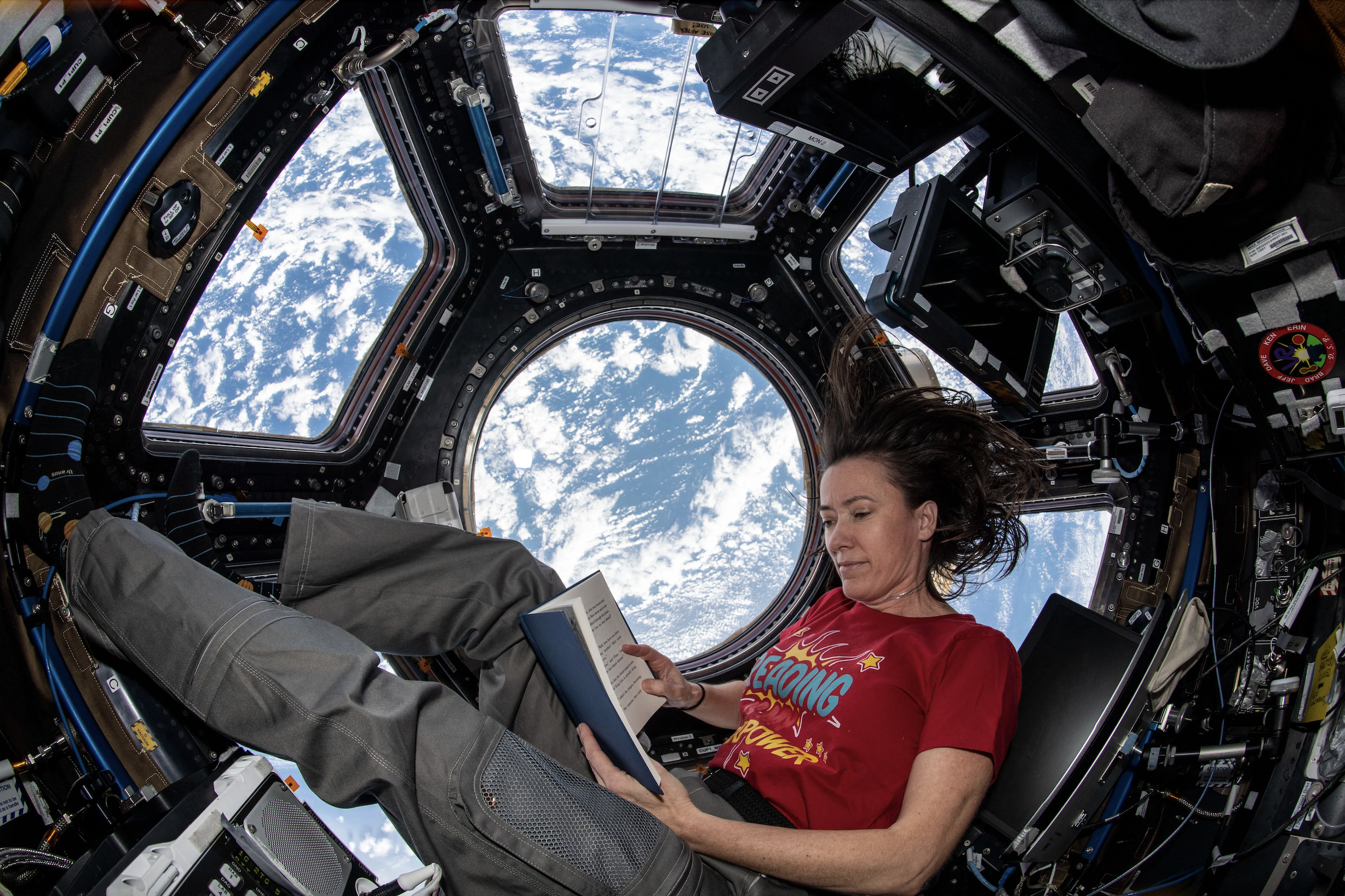 Right / below: Nestled amid electronic equipment arrayed around the ISS cupola, NASA astronaut Megan McArthur takes a reading break (Image: NASA).