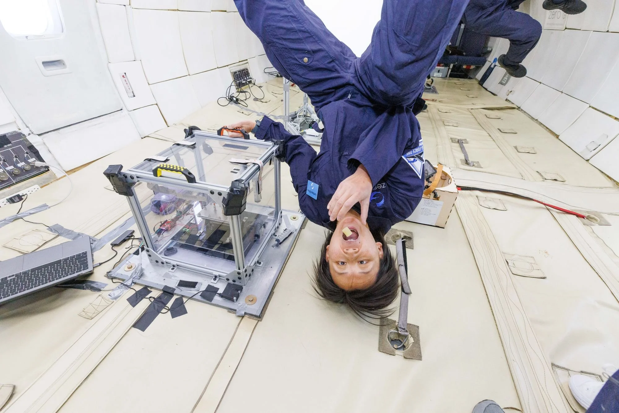 Right / below: Researcher Larissa Zhou tries some pasta boiled in her H0tP0t sous-vide project during a MIT Space Exploration Initiative ‘zero-g’ flight (Image: Steve Boxall / ZERO-G).