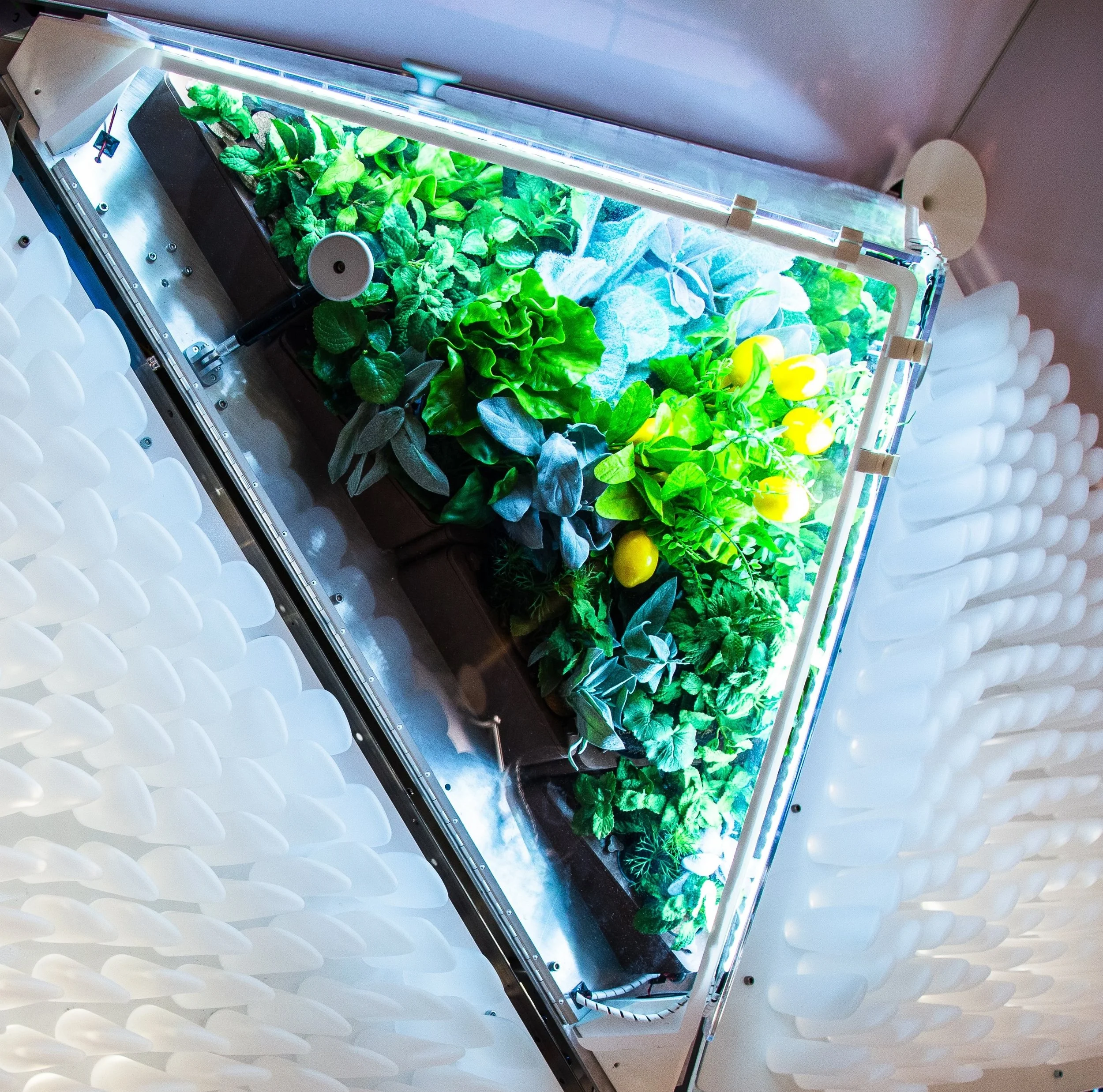 The central focus of the kitchen is the “Green Vault”, a functional microgravity-compatible aeroponic garden, testing how to grow fresh produce for astronaut nutrition and biophilia-related mental health. Water and nutrients are pushed through nozzles at a high pressure, reaching plant roots as a fine mist of tiny droplets. This growing method, in use on the ISS, reduces the amount of substrate that needs to be sent up into orbit while supplying astronauts with a steady fresh food source.